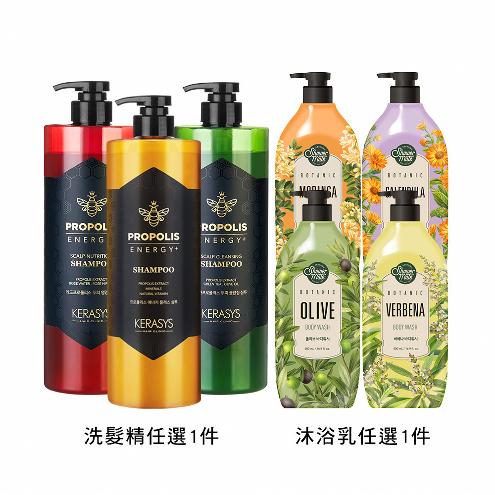 【KERASYS可瑞絲】蜂膠活力光澤洗髮精1000ml-紅蜂膠/活力光澤/綠蜂膠(任選1入)+【ShowerMate 】療癒植園花草沐浴乳500ml/瓶(任選1入)